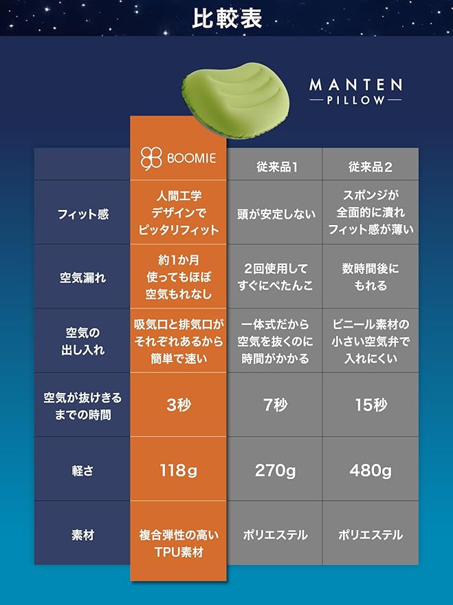 満天ピロー【至福の寝心地x軽量コンパクト】 キャンプ 枕 エアーピロー アウトドア枕 空気枕 コンパクト 超軽量 高さ調整可能 車中泊 収納袋付き boomie (ブラック)