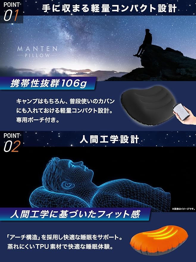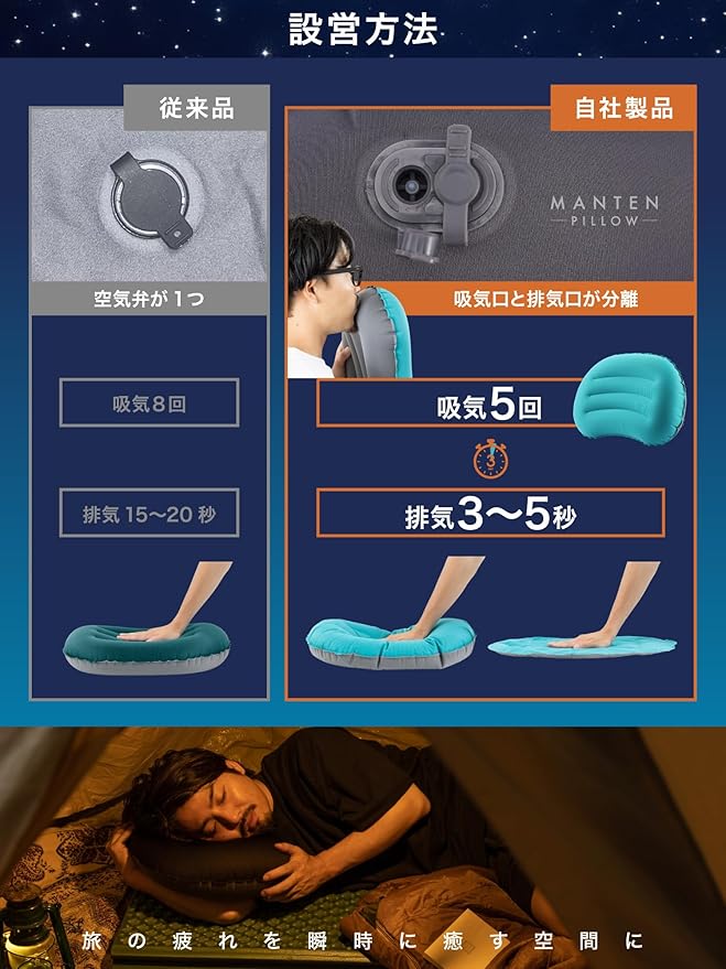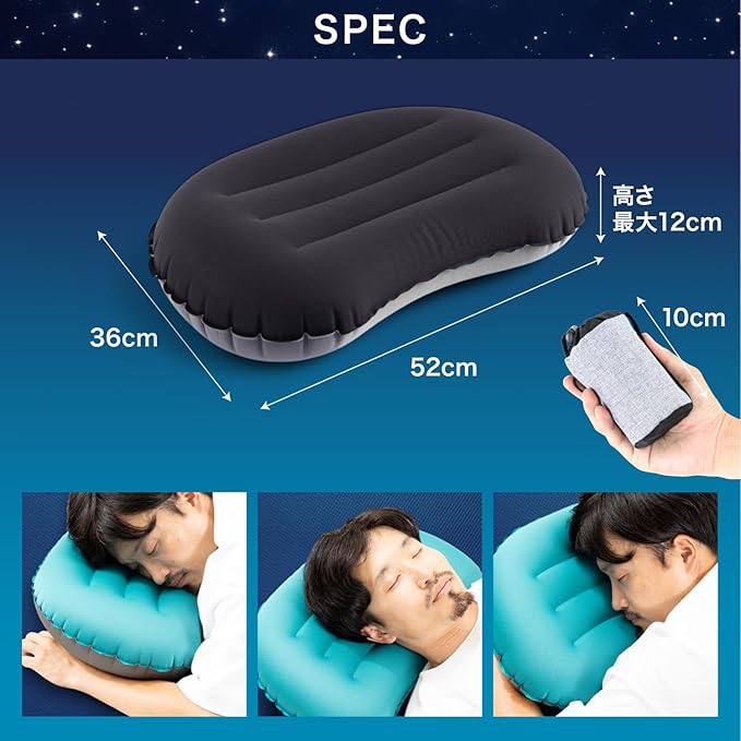 ✅【本体重量106g超軽量設計】普段は小さく。空気を入れればホテルの枕のような寝心地。付属の専用ポーチに入れれば持ち運びもコンパクト。