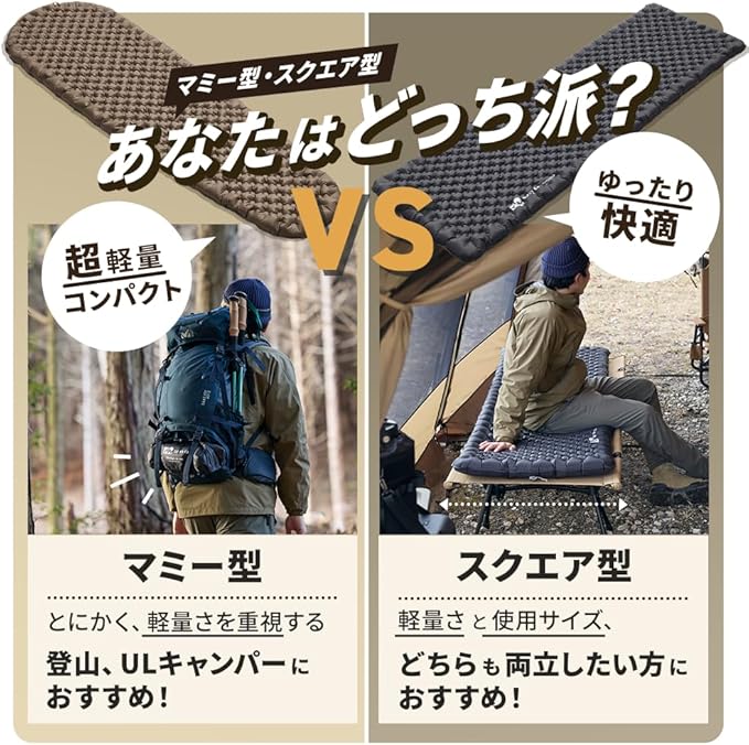 【製品仕様】カラー:タン/ブラック サイズ:スクエア : (約)186 64 7(cm) 収納時(約)27 10(cm) マミー : (約)183 58 7(cm) 収納時(約)24 10(cm) 重量:スクエア(約)765g(収納袋含む:870g)/マミー(約)640g(収納袋含む:725g) R値:マミー:6.8 / スクエア:7.0 材質:20Dナイロン セット内容:エアマット本体 / 収納袋 / エアバッグ / リペアキット(シールタイプの補修シートです。接着剤は別途付属しておりません。) / 取扱説明書