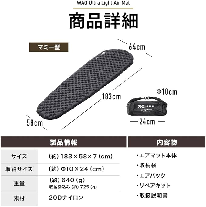 WAQ Ultra Light AirMat ウルトラライトエアマット アウトドア 7cm R値6.8 R値7.0 超軽量 コンパクト キャンプ 登山 簡単収納 エアバッグ付 リペアキット付 r値 マット 車中泊 テント泊 防水 防災 (マミー - BLACK)