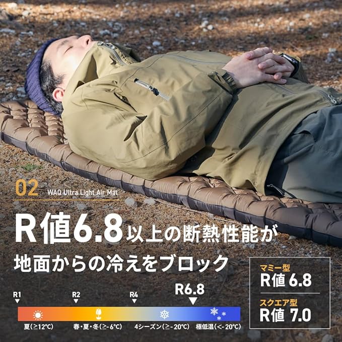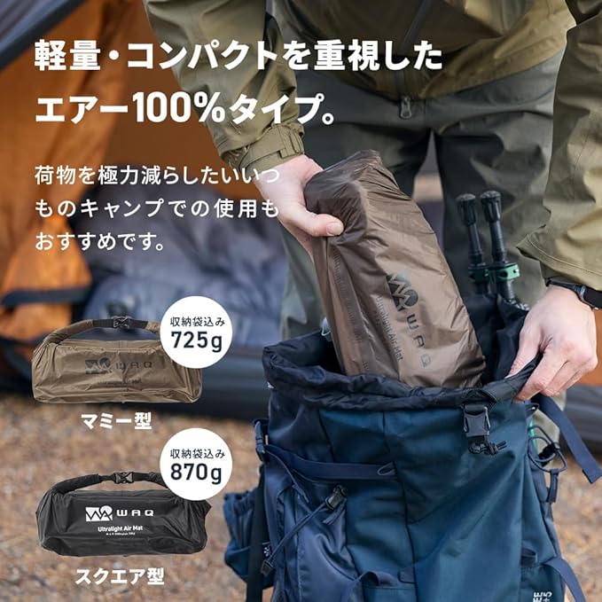 【WAQ Ultralight Air Mat】高R値、軽量、コンパクト3拍子揃ったエアマット。マミー型で約640g、スクエア型で約765gとWAQのマットシリーズ中で最も軽いマットに仕上がりました。軽量性を重視する方には最もコンパクトなマミー型、車中泊やキャンプなど積載に余裕があり快適性も両立させたい方はスクエア型がオススメです。
