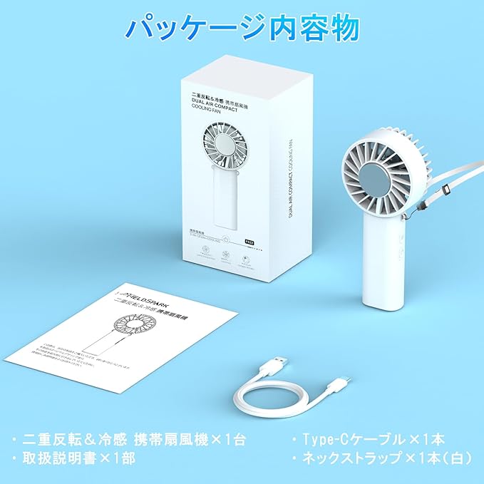❄️【製品仕様】● 商品名:二重反転&冷却 携帯扇風機 ● 限定商品:FieldSpark ● サイズ(約): 17.6 8.0 4.5cm ● 質量:約206g ● 羽数:5枚 2個 ● DCモーター数:2個 ● パッケージ内容物:携帯扇風機 1台、Type-Cケーブル 1本、取扱説明書 1部、ネックストラップ 1本 ● 電池容量:3000mAh