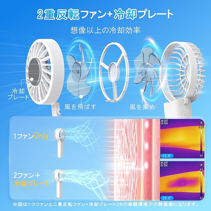 ハンディファン 冷却プレート 二重反転ファン 携帯扇風機 【2025年夏モデル・瞬間冷却-20℃】 大風量 静音 3WAY (手持ち 首掛け 卓上) 手持ち扇風機、 USB充電 Type-C 対応 取扱説明書付き PSE認証済、ホワイト