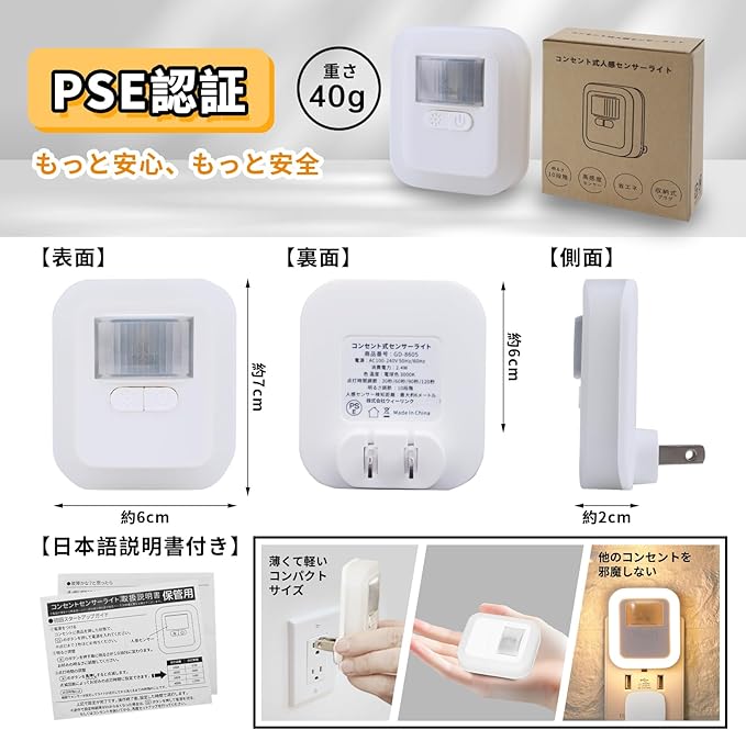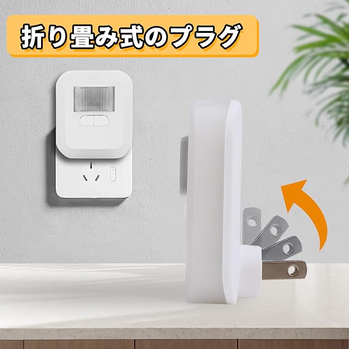 【折りたたみ式プラグ+コンパクトデザイン】このセンサーライトは、60mm 20mm 70mmのコンパクトな折りたたみ式デザインで、使用時に他のコンセントの使用を妨げません。小型ながら、必要なエリアを十分に照らす明るさを提供します。折りたたみ式のため、収納や持ち運びが簡単で、引っ越しの際には収納箱に簡単に収めることができます。