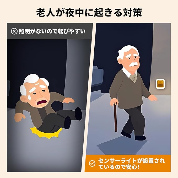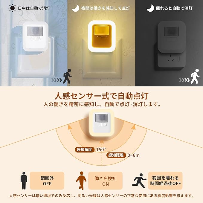 【人感センサー+4段階の点灯時間調整】この人感センサーライトは、4段階の点灯時間を調整できます。長押しで明るさ調整ボタンを押すだけで、簡単に設定変更できます(ライトが点滅して段階変更をお知らせします)。点灯時間は30秒、60秒、90秒、120秒の4段階から選べますので、さまざまなニーズに対応します。【人感センサーの反応範囲】150度の広角センサーを搭載し、3~6メートルの範囲内で人体の動きを感知し、暗い場所でも安全を確保することができます。夜中のトイレや帰宅時に便利で、手軽に明かりを点けて、安心して行動できます。