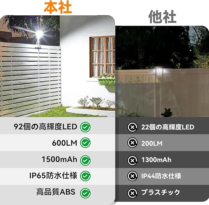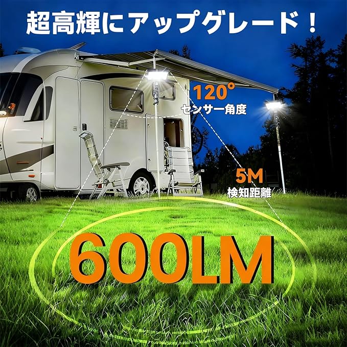 ☀️ 【600ルーメンの超高輝度&120 広角センサー】92顆の高品質LEDが、最大600ルーメンの広範囲を照らす光で、玄関や庭を昼のように明るくします。5m先・120 の広範囲をカバーする人感センサーが侵入経路を監視し、不審な動きを素早く検知。夜間の防犯性と安全性を格段に向上させます。