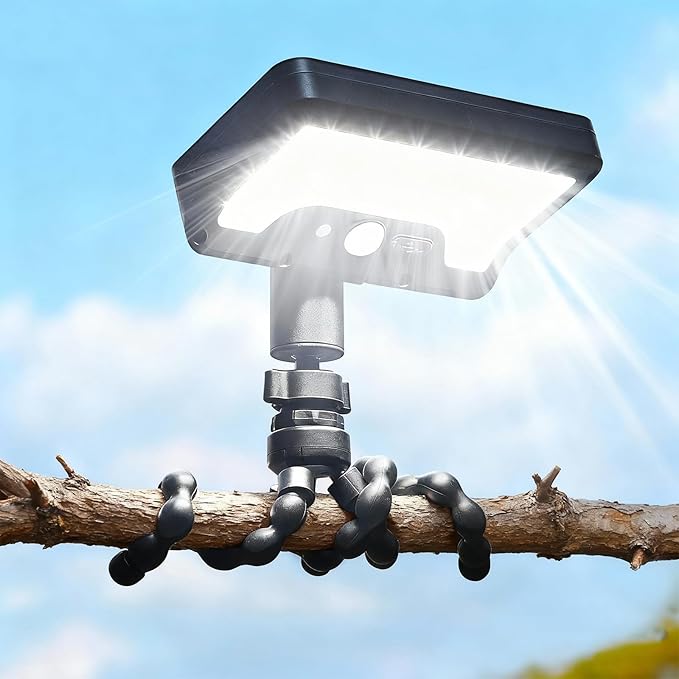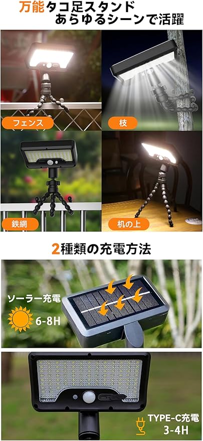 ソーラーライト 92高輝度LED 3つ点灯モード 1500mAh フレキシブル三脚付 & 360度調整ランプ IP65防水 600LM 品質ABS 耐雪性能 ソーラー/Type-C充電 常夜灯 駐車場 壁 フェンス 防犯対策 停電・災害時に適用 昼白色