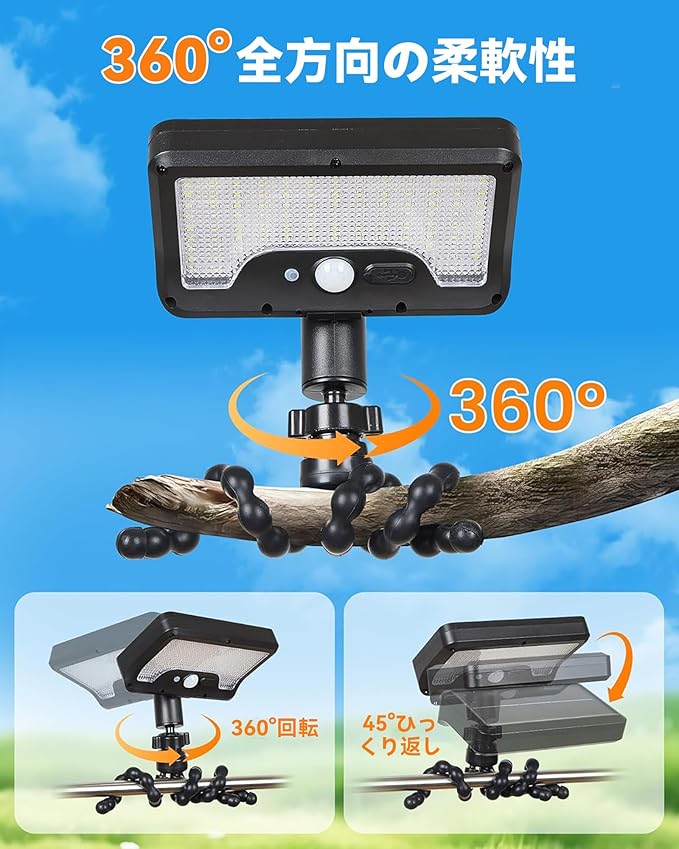 【360 全方向調整&据え置き両用デザイン】ランプヘッドは360 自由調整可能で、柔軟な三脚が付属。凹凸のある壁やフェンス、庭木など、あらゆる場所にぴったりと設置できます。実用性とおしゃれなデザインを両立し、防犯機能はそのままに、昼間の景観も美しく彩ります。