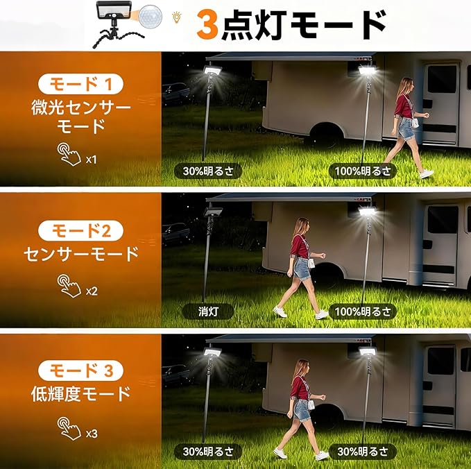 【3モード切替えで省エネ&防犯を両立】お好みやシーンに合わせて選べる3つの智能モードを搭載。 ① DIMモード:人を感知すると明るく点灯し、15~20秒後に柔らかい常夜灯に切り替わり、省エネながら防犯性を維持。 ② センサーモード:暗闇で動きを感知した時のみ、自動で点灯・消灯。必要な時にだけ光る、理想的な防犯ライトです。 ③ 常夜灯モード:一晩中優しい灯りで、足元を静かに照らし続けます。