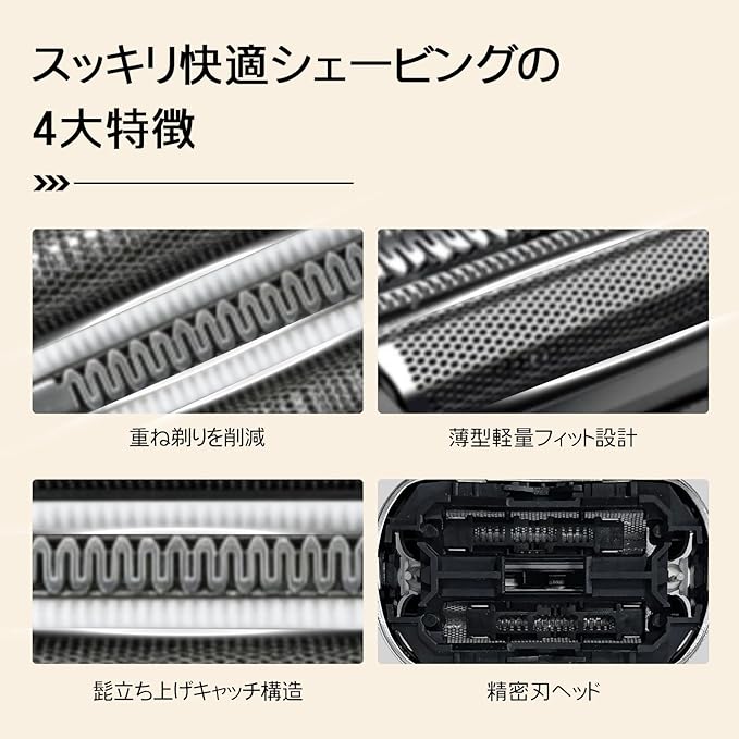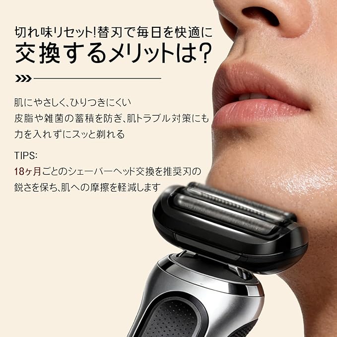 【定期交換のおすすめ】シェービング部品は使用するにつれて徐々に摩耗し、密着度や快適さが低下します。そのため、快適な剃り心地を保つためには、定期的にシェーバーのメッシュとヘッドを交換することをおすすめします。 ご注意:本品は純正品ではなく、コストパフォーマンスに優れた互換品です。