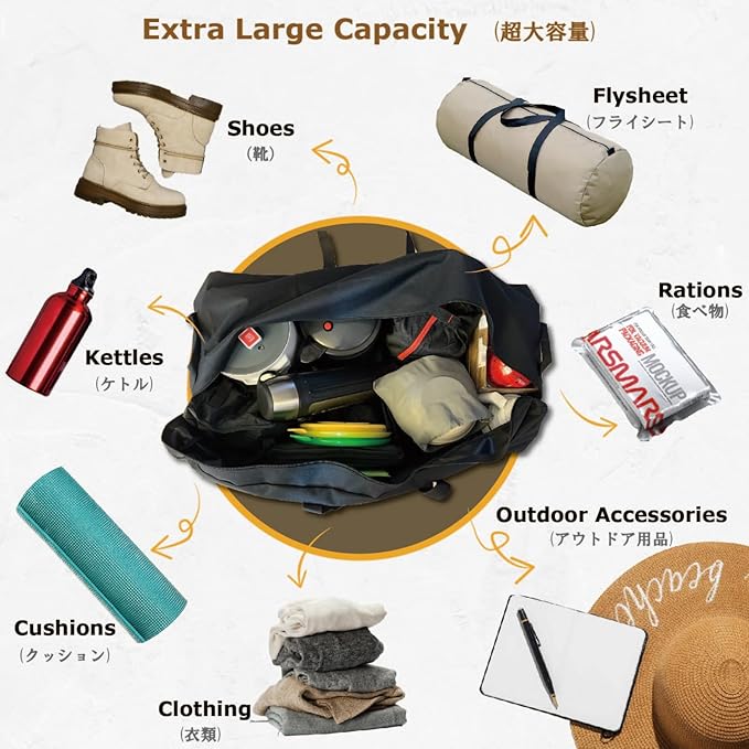 ✅【用途が広い】- ツーリング、キャンプ、引っ越し、布団収納、グッズ保管時に使えるビッグバッグです。テント、ポール、寝袋、タープ、ランタンスタンド、折り畳み椅子などのキャンプ用品は十分いれられます