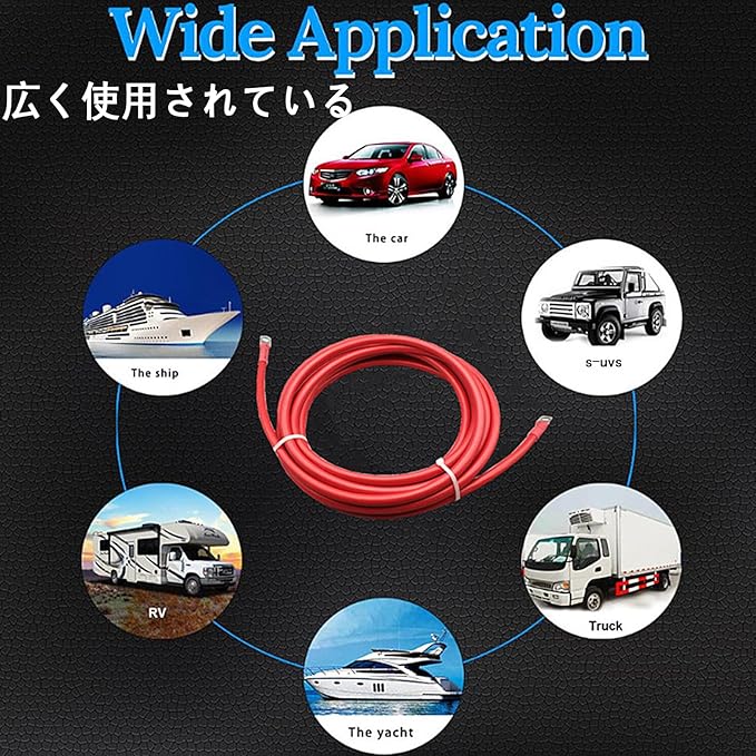 【適用範囲】インバーターケーブルは、自動車、トラック、マリンボート、ソーラー、RV、トレーラー、ゴルフカー、オートバイ、芝刈り機などの電力用途によく使用されます。