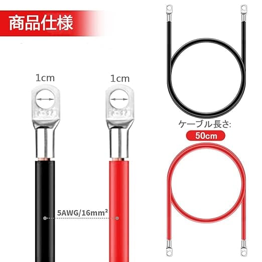 セット内容:長さ 50cm、入数 黒、赤 各1本、バッテリー側ネジ径10mm、芯線直径:4.5mm、芯線面積(SQ):16mm 、参考ゲージ数 5AWG、丸型圧着端子:R16-10、許容電流値 100A。