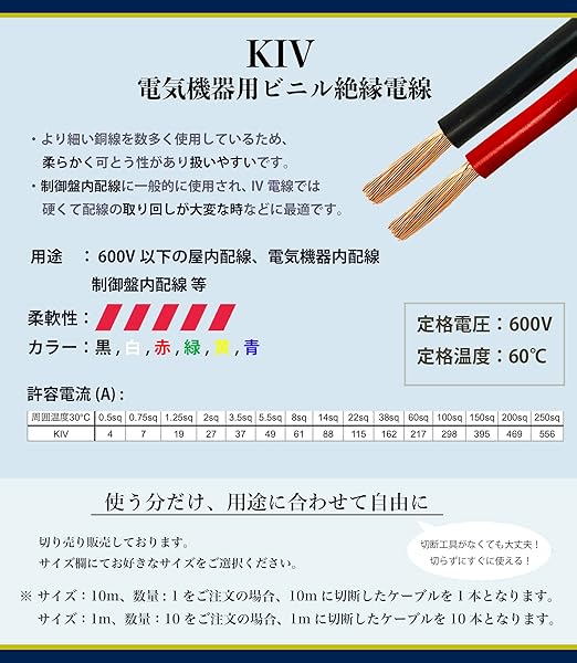 導体に可とうより線 電線:KIV サイズ:8SQ 定格電圧:600V 定格温度:60℃ 芯線面積:8m㎡ 導体外形:3.7mm 被覆厚:1.2mm 電線外形:6.1mm 許容電流:61A 耐電圧:2000V/1min.