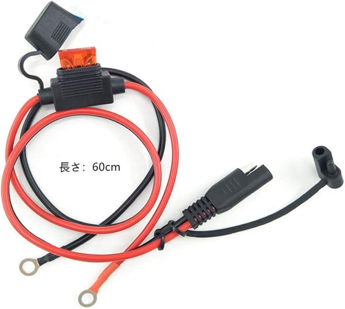 印加電圧:12V-36V ヒューズボックスに内蔵の10Aヒューズ ケーブル仕様:16AWG(1.31平方) 長さ:60cm SAEコネクタにはヒューズ付きの穴あき端子があり、バイク、トラクター、車、ボートなどのバッテリーを充電するためにバッテリーに簡単に固定できます。 SAEコネクタ SAEは 12Vアイレットターミナ。ヒューズへのプラグをすばやく切断します オートバイ、スノ1ーモービル、トラクターなどに適しています