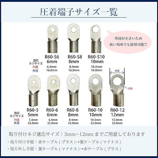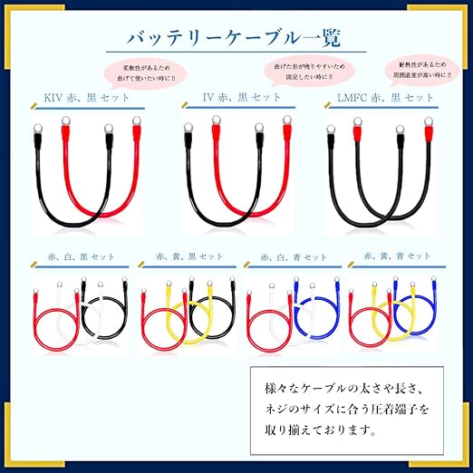 バッテリーケーブル 増設用並列ケーブル IV線 60SQ 赤黒セット各色0.5m R60-S8 600V 両端丸形圧着端子 ビニル絶縁電線 バッテリー常時電源