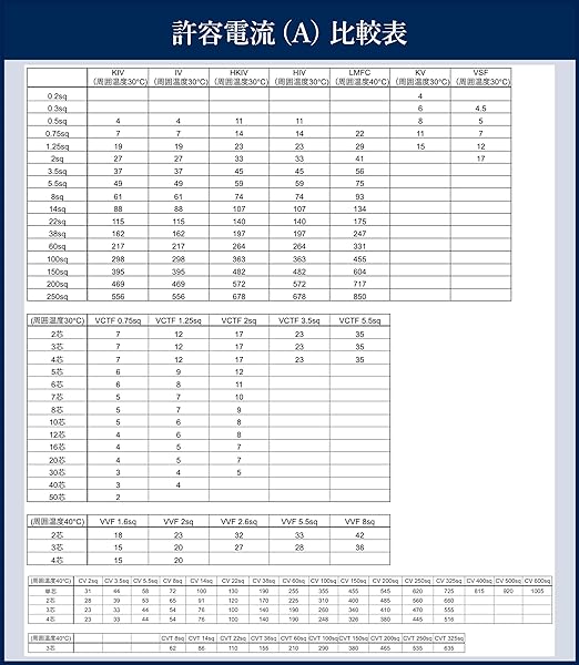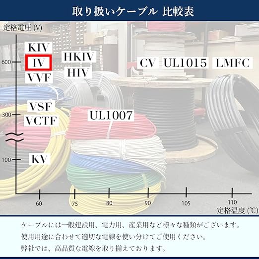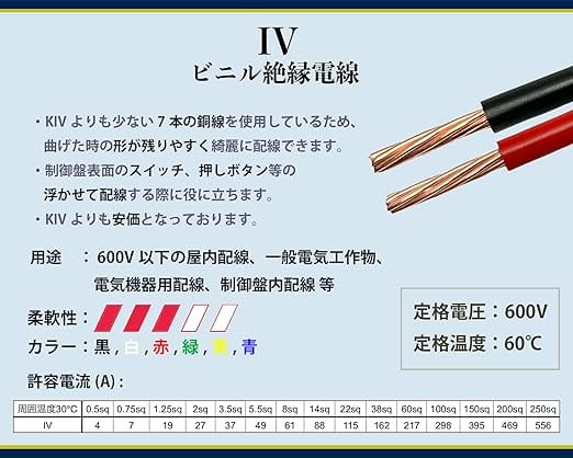 電線:IV サイズ:60sq 定格電圧:600V 定格温度:60℃
