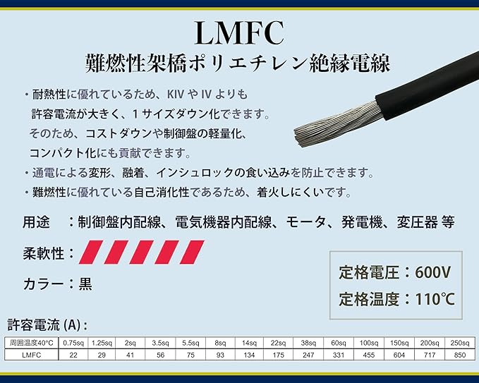 すずめっき軟銅より線 電線:LMFC サイズ:22sq 定格電圧:600V 定格温度:110℃