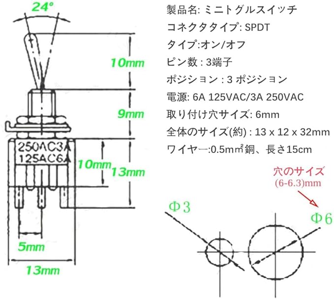 電圧/電流:AC125V 6A / AC250V 3A