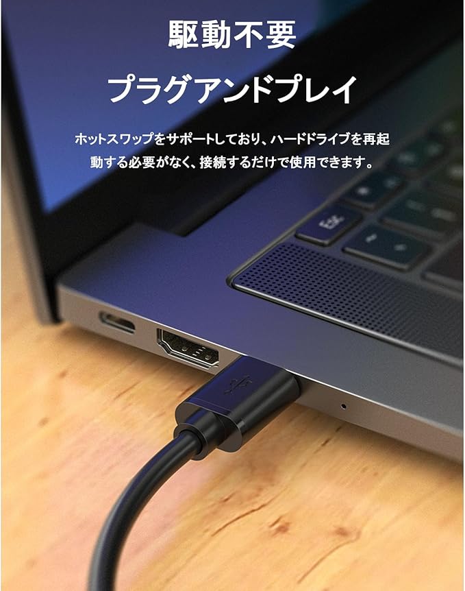 【耐久性】ドライバーは不要で、プラグアンドプレイ。形成されたストレインリリーフコネクタとグリップトレッドによる耐久性と、簡単な抜き差しを実現。