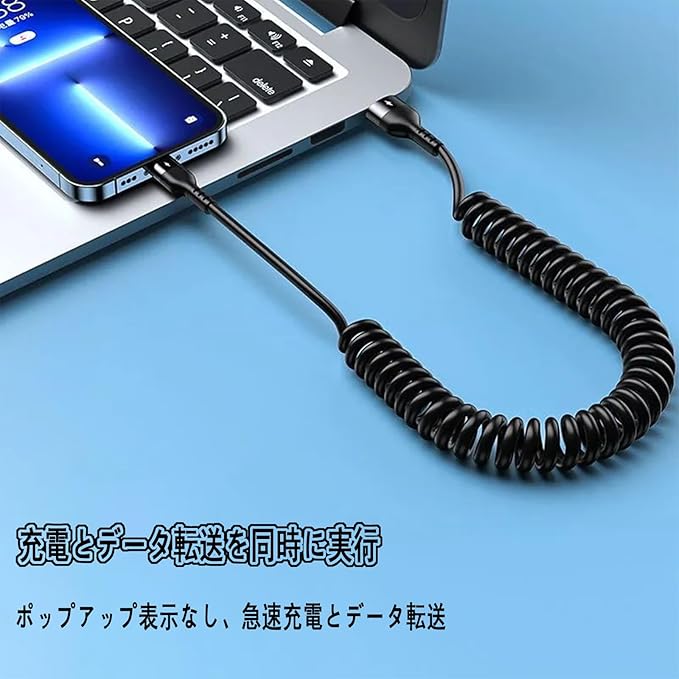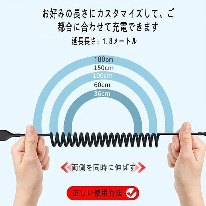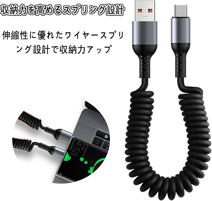 USB C ケーブル 0.35Mから1.5Mまで 伸びる TPU素材 PD対応 高耐久 コイル型 66W 6A スプリング式 巻き取り式 携帯電話充電ケーブル Phone15/16/X-peria/G-alaxyその他Android各種などUSB-C機器対応(タブレットはサポートされていません)