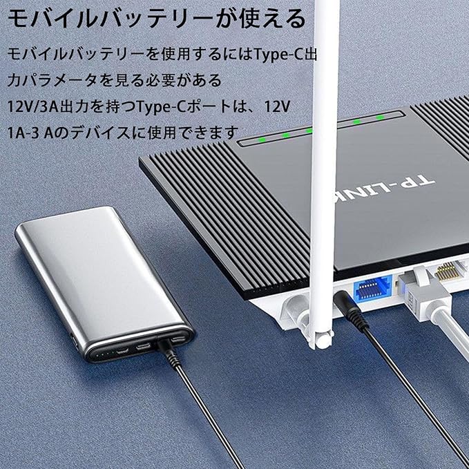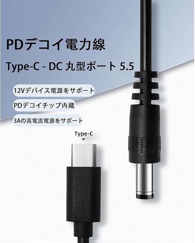 【商品仕様】入力:12 V、出力:12 V 3 A。商品の長さ:1 m。入力端子:USB Type-C、出力端子:DC 5.5*2.5 mm。