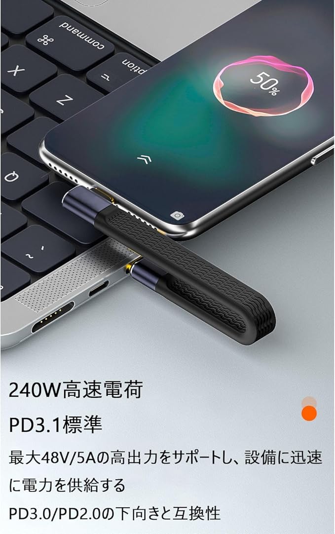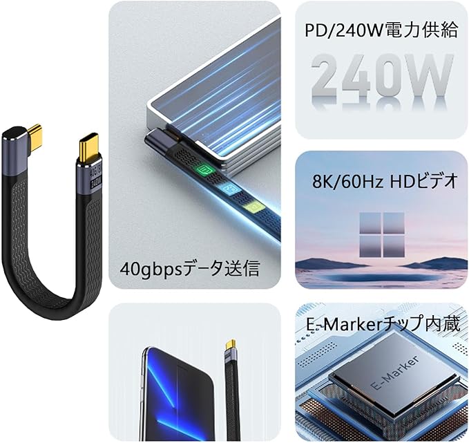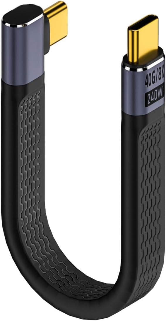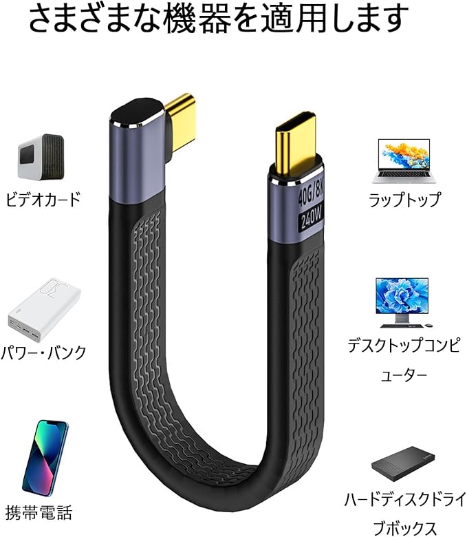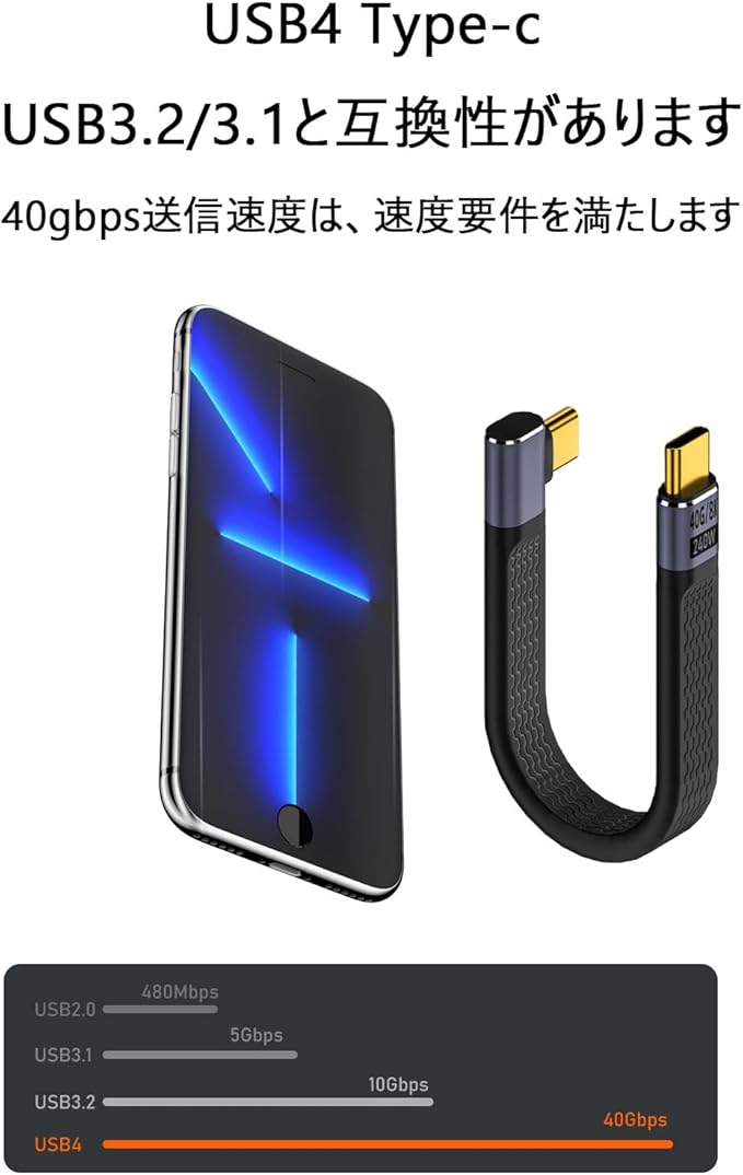 短いUSB Type-CtoC ケーブル 40Gbps高速データ転送&PD対応240W/5A急速充電& 8K@60Hz映像出力 サイドベンド USB-C to USB-C ケーブル 約13cm USBケーブル フラットケーブル