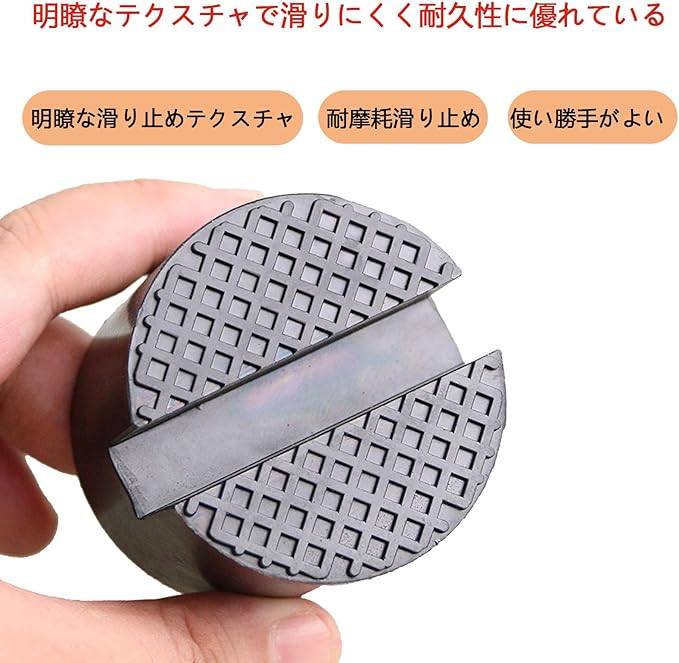 【滑り止め設計】ジャッキアダプターは、表面に凸凹の設計を採用していますので、ガレージジャッキで持ち上げた際に不安定で危険な状態になるのを防ぎ、しっかりとした安定性で安全な作業が可能になります。