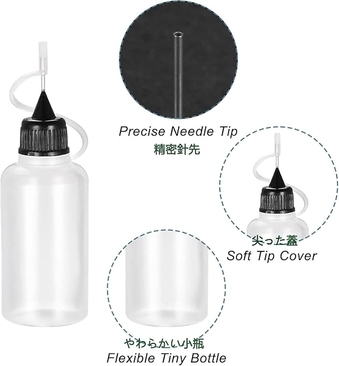 透明なボトルなので、中身が確認しやすく、残量がひと目でわかります。先端は耐錆性の高い金属製で、耐久性があります。ソフトプラスチック製なので押し出しやすいです。その微細な先端は正確な数の接着剤を使うのに適しています。柔軟なボトルは押し出しやすく、穴を開けるのに適しています。