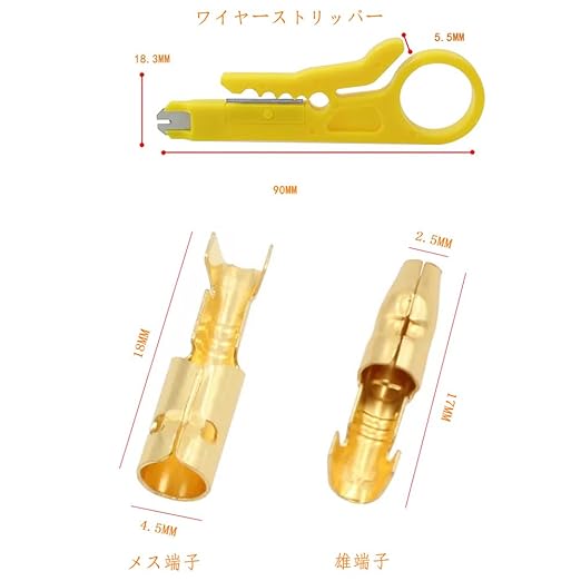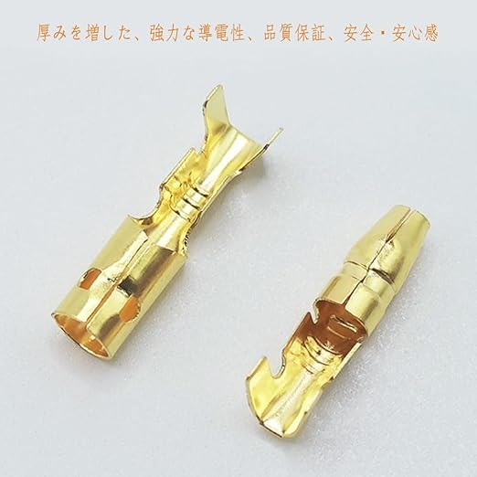 ギボシ端子 パッケージ内容 ゴールドプレート端子セットは、ピックオンスイッチ、スピーカー、フレア等に使用され、3.9mmオス、メス、オス用ソケットとメス用ソケット各100個、外部専用工具を一つ、これら接続端子は自動車、オートバイ、家庭の内装、配線作業と修理に使用できます。