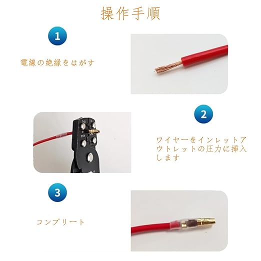 ギボシ端子 使いやすさを追求した 絶縁スリーブをケーブルに接続し、ケーブル両端のメスとオスコネクタ端子を接続して結合します。 注意:銅線部分と端子の中心の爪がしっかり詰まっています。 専用のバッテリープライヤー/コードプライヤーで配線を接続します。