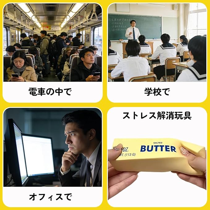 リアルな感触でストレスを解消:本物のバター塊のようなリアルな質感と、ゆっくりと元に戻るスローモーションが特徴です。握る、揉む、伸ばすといった動作が深いリラックス効果をもたらし、緊張や不安を和らげ、集中力を高めます。