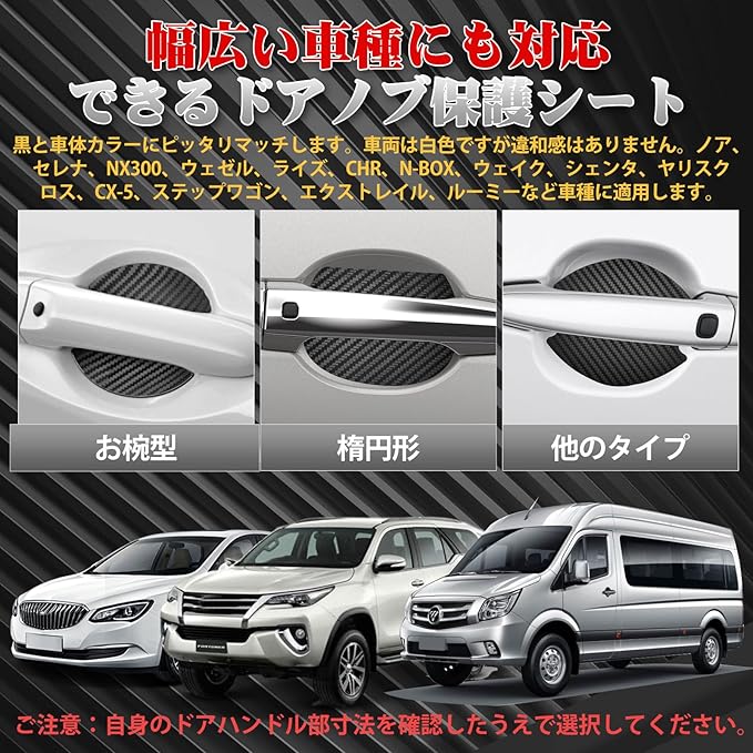 【あなたの愛車を守る】WyBrightのドアプロテクターは様々な商用車、乗用車、SUV、トラックなどに適用します。5ドア車でも本品1セットで取り付けできます。N-BOX、N-VAN、N-WGN、フリード+、ノア、デリカd5、モデルなどの車種に適用します。ハサミで簡単に切れたので商品外周の四つの角はハサミで少し丸くカットして取り付けます。自身のドアハンドル部寸法を確認したうえで選択します。