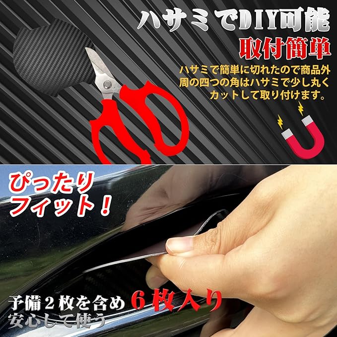 【ご安心サポート】商品セット内容:ドアハンドルプロテクター*6枚入り、日本語説明書*1。取付方法の詳細な説明書が付き、初心者でも簡単に装着ができます。予備2枚を含め6枚入りなので、取り付けに失敗しても安心してください。 製品に対して何か質問と問題があれば,どうぞお気軽にお問い合わせ下さい。