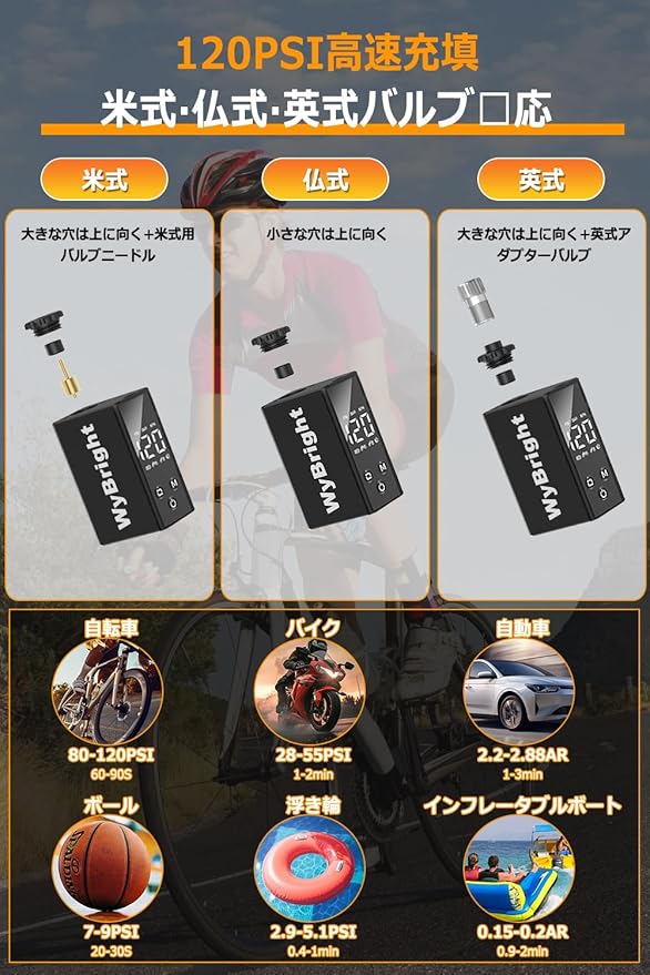 2025超小型 自転車 空気入れ 電動ポンプ ロードバイク 120PSI 携帯便利 自動停止 急速充電 自転車 空気入れ コンパクト 米式仏式英式バルブ対応 ボール/ロードバイク/クロスバイク/ママチャリ タイヤ対応 収納袋/日本語説明書付き