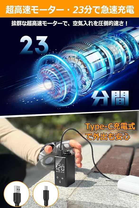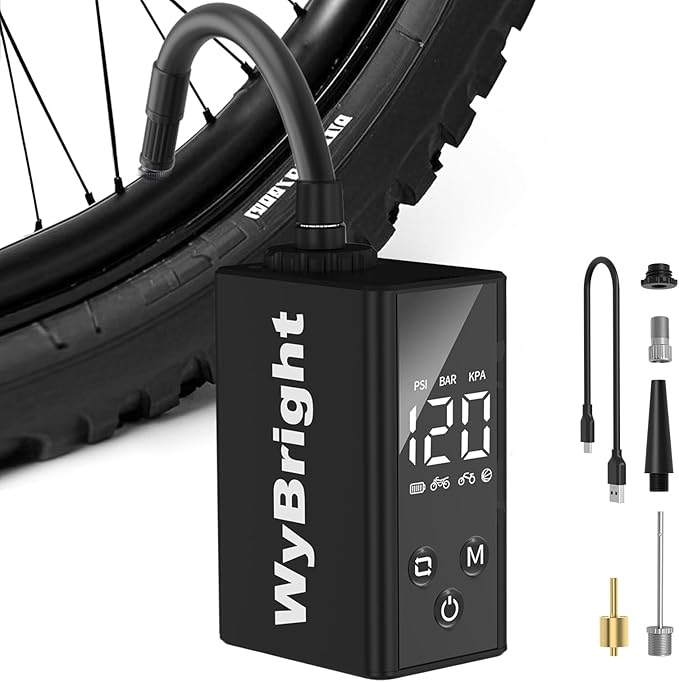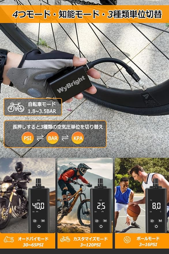 【一台多役・Type-C 急速充電】WyBright 電動空気入れは、ロードバイク、マウンテンバイク、電動自転車、バイク、ボールなどが使用できます。初めて使用前に完全に充電します。フル充電にはわずか23min満充電で、少なくとも4つの100*23Cタイヤを0から100PSIまで膨らませることができます。