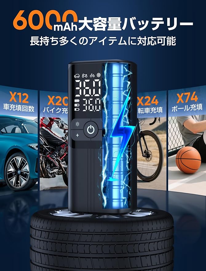 【6000mAh 大容量バッテリー&高効率充填性能】空気入れは大容量6000mAhバッテリーを内蔵し、満充電時には自転車タイヤ約35回、バイクタイヤ約20回、自動車タイヤ約12回、バスケットボール約72回の充填が可能です。毎分25,000回転の高効率モーターにより、ボールは約10秒、タイヤは約1分という驚異的な速さで充填完了。車載充電にも対応しており、アウトドアや緊急時でも安心してご利用いただけます。