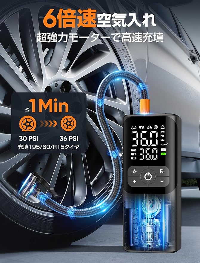 自転車 空気入れ 電動空気入れ 【2025年新モデル|超高速充填・自動停止】エアーポンプ コードレス 6000mAh大容量 最大圧力150PSI 自転車/バイク/自動車/ボール/浮き輪対応 仏/英/米式バルブ対応 SOS/LED懐中ライト