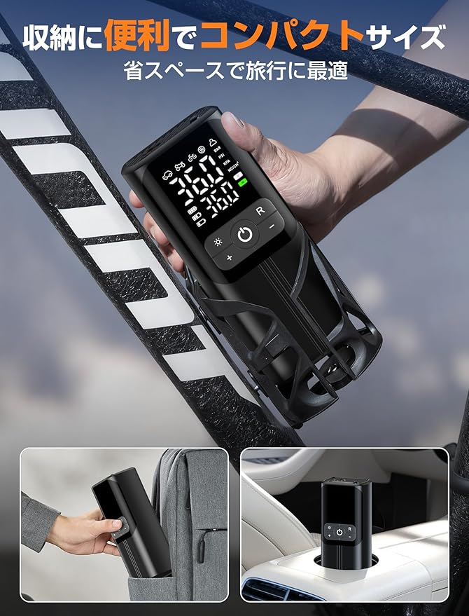 【4+Nスマートモードと携帯性に優れた設計】この自転車空気入れ は4+Nスマートモードを備えています。4つのスマートモードは、車モード、オートバイモード、自転車モード、ボールモードです。また、カスタムモードでは、異なる空気に応じて必要な圧力を設定することができます。また、そのコンパクトなサイズは簡単に車、自転車ラックやパックに入れることができます。