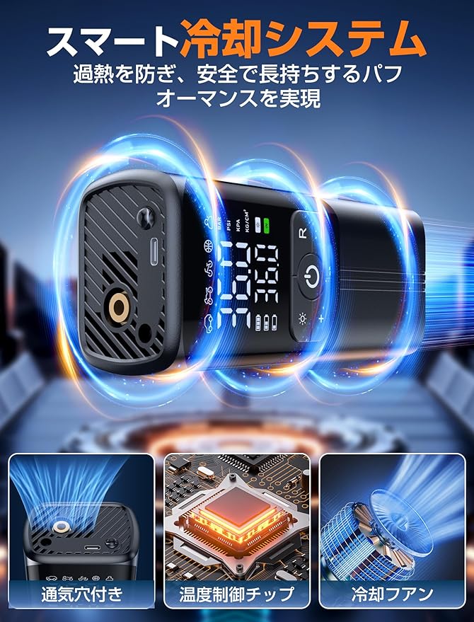 【高精度LCDデジタル表示と4つの単位切替】電動空気入れは高精度なLCDデジタル画面を搭載し、 1psiの精度でリアルタイムの圧力値と設定値を明確に表示します。PSI、BAR、KPA、KG/CM の4種類の単位をワンタッチで切替可能で、国内外問わずあらゆる環境で使用でき、タイヤの状態を正確に把握できます。視認性の高い画面には圧力モード・バッテリー残量・設定圧力・リアルタイム空気圧値が同時表示され、昼夜を問わず快適な操作を実現します。