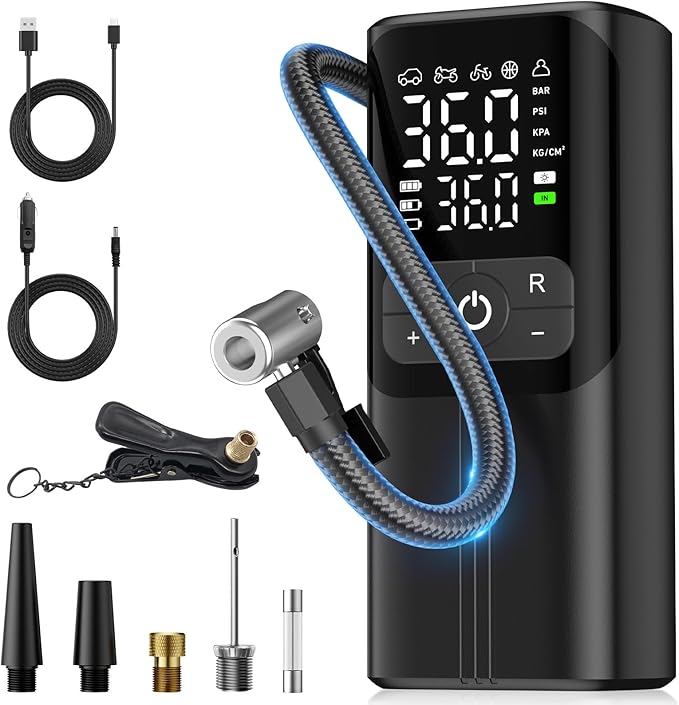 【充実の付属品】空気入れは温度が低すぎる場所に保管しないでください。また、充電中は使用しないでください。タイヤに空気が入っていない場合は、タイヤに漏れがないか確認してください。以下を含む:空気入れ本体、米式延長ホース、ボート用ノズル、浮き輪用ノズル、英式变換バルブ、仏式変換バルブ、Type-C充電ケーブル、ボール用ニードルバルプ。