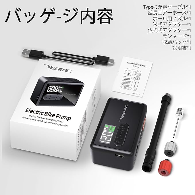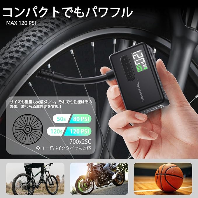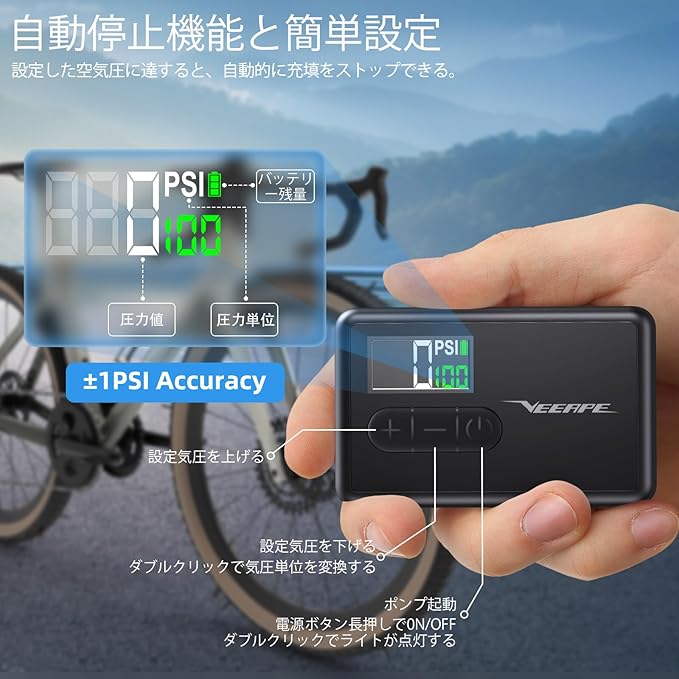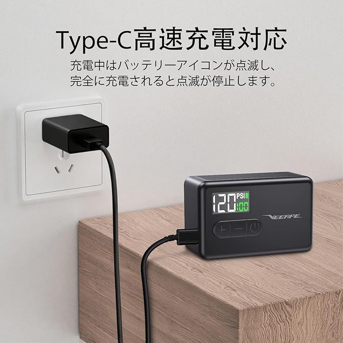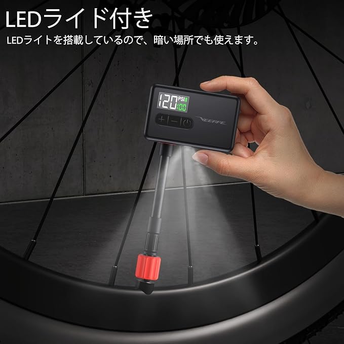 VEEAPE 自転車 空気入れ 電動 120PSI ロードバイク 携帯電動ポンプ Type C 充電式 超小型 軽量 電動エアコンプレッサー 気圧表示 自動停止 米式仏式バルブ対応 日本語説明書