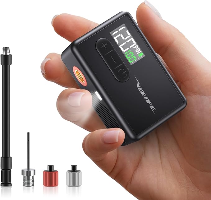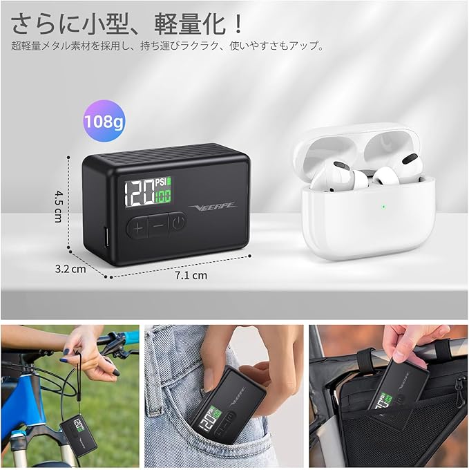 【コンパクト】 VEEAPE自転車 空気入れは重量 108g 、サイズ: 7.1 x 4.5 x 3.2cm、 コンパクトで軽量、片手での使用に最適です。ポケットに入れたりして持ち運びや保管が可能です。