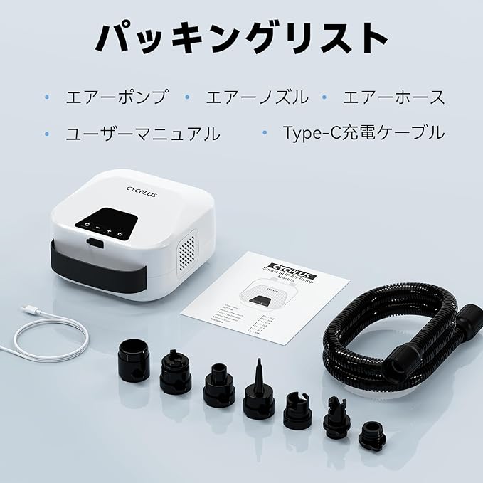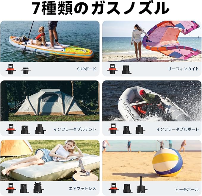 【パッケージ内容】パッケージには以下が含まれています:1✖エアポンプ、1✖50cm柔軟ホース、6✖エアノズル、1✖ボストンノズル、1✖Type-C充電ケーブル、1✖ユーザーマニュアル。スタンドアップパドルボード、カイト、テント、マットレスに対応します。
