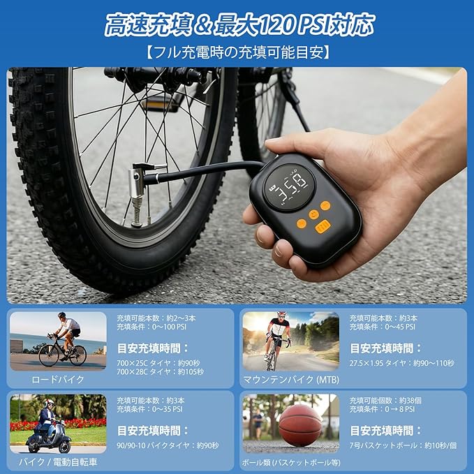 【多様なアイテムに対応する高い汎用性】本製品は電動空気入れとして、最大120PSIまでの高圧充填を実現。米式/仏式/英式バルブ対応のため、日本国内で使用されるほとんどの自転車タイヤにそのまま接続できます。ロードバイクやマウンテンバイク、MTBから日常的な街乗り自転車、子供用自転車まで、幅広い車種のタイヤに対応。さらに付属のボール用ニードルや浮き輪用インターフェースを使用すれば、バスケットボールやサッカーボール、水遊び用浮き輪など、様々なアイテムの空気入れが可能です。この多機能設計により、ご家庭に一台あれば、あらゆるシーンで活用いただけます。