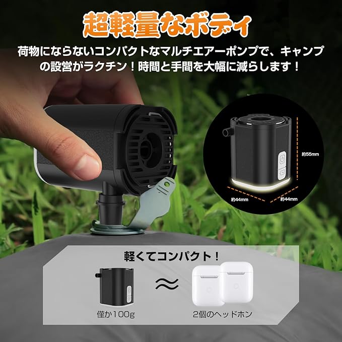 【超小型エアーポンプ】電動エアーポンプは、わずか100gの超軽量で、収納や持ち運びがとても便利です。コンパクトなサイズで、ワンボタンで簡単に操作でき、手のひらサイズのため子供でも簡単に使用できます。ビーチ、キャンプ、アウトドアなどでも大活躍します。