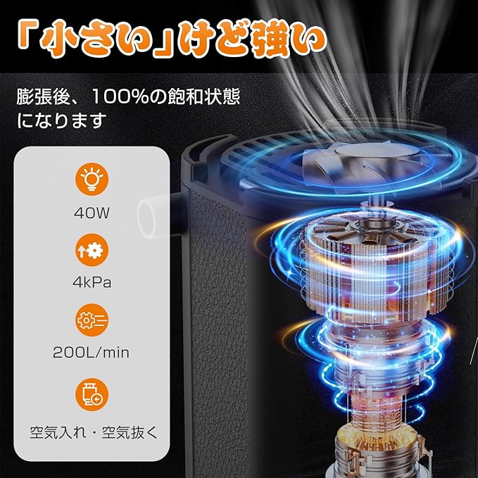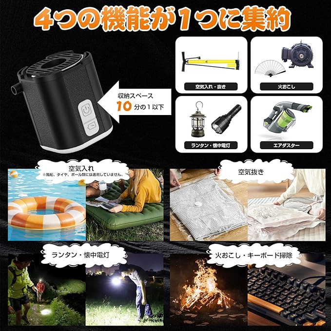 【強力な空気入れと空気抜き】コンパクトだけど風密度200L/分と強力で、4kpaの空気入れる圧力と空気抜く圧力により、エアマットレスを素早く空気入れることができます。 キャンプ、アウトドアでこれがあれば準備が楽ちんです。また、完璧な家庭旅行用品です。は迅速に圧縮袋の空気を抜いて、収納スペースを50%以上節約できます。アウトドア用品や衣類を保管するために多くの時間とスペースを節約できます。