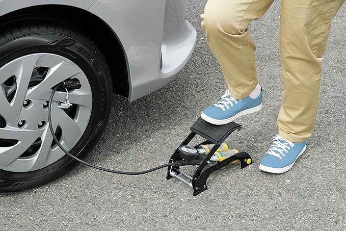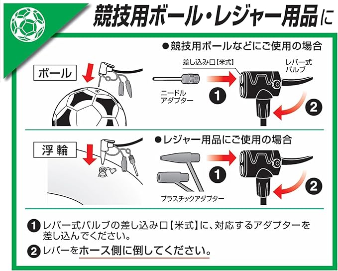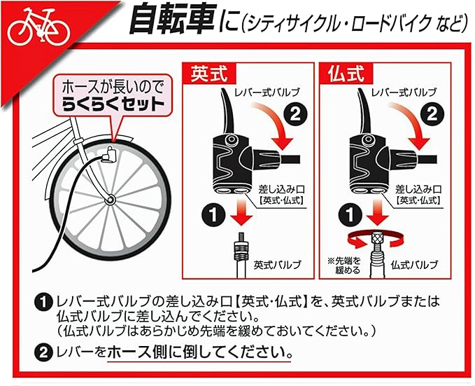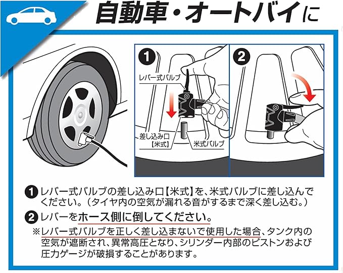 ※オートバイや自動車の空気を入れるときは、レバー式バルブをタイヤの空気が漏れる音がするまで差し込みながらレバーを倒してください。