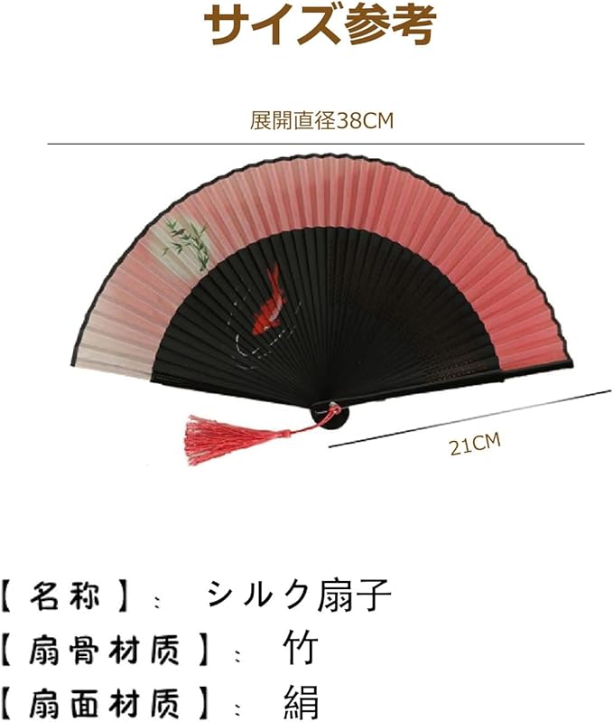 【サイズ】:長さ21cm、展開幅38cm、重さは28gぐらいで軽くて小さくてとても運びやすいです。ハンドバックを置けるだけではなく和服の帯に挿せます。コンパクトに折りたたみ式です。