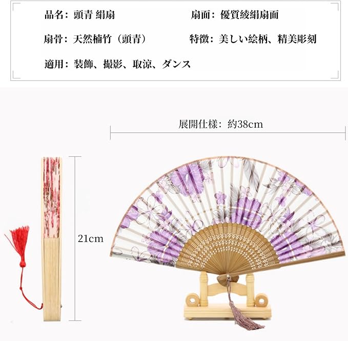 【サイズ】:長さ21cm、展開幅38cm、重さは28gぐらいで軽くて小さくてとても運びやすいです。ハンドバックを置けるだけではなく和服の帯に挿せます。コンパクトに折りたたみ式です。